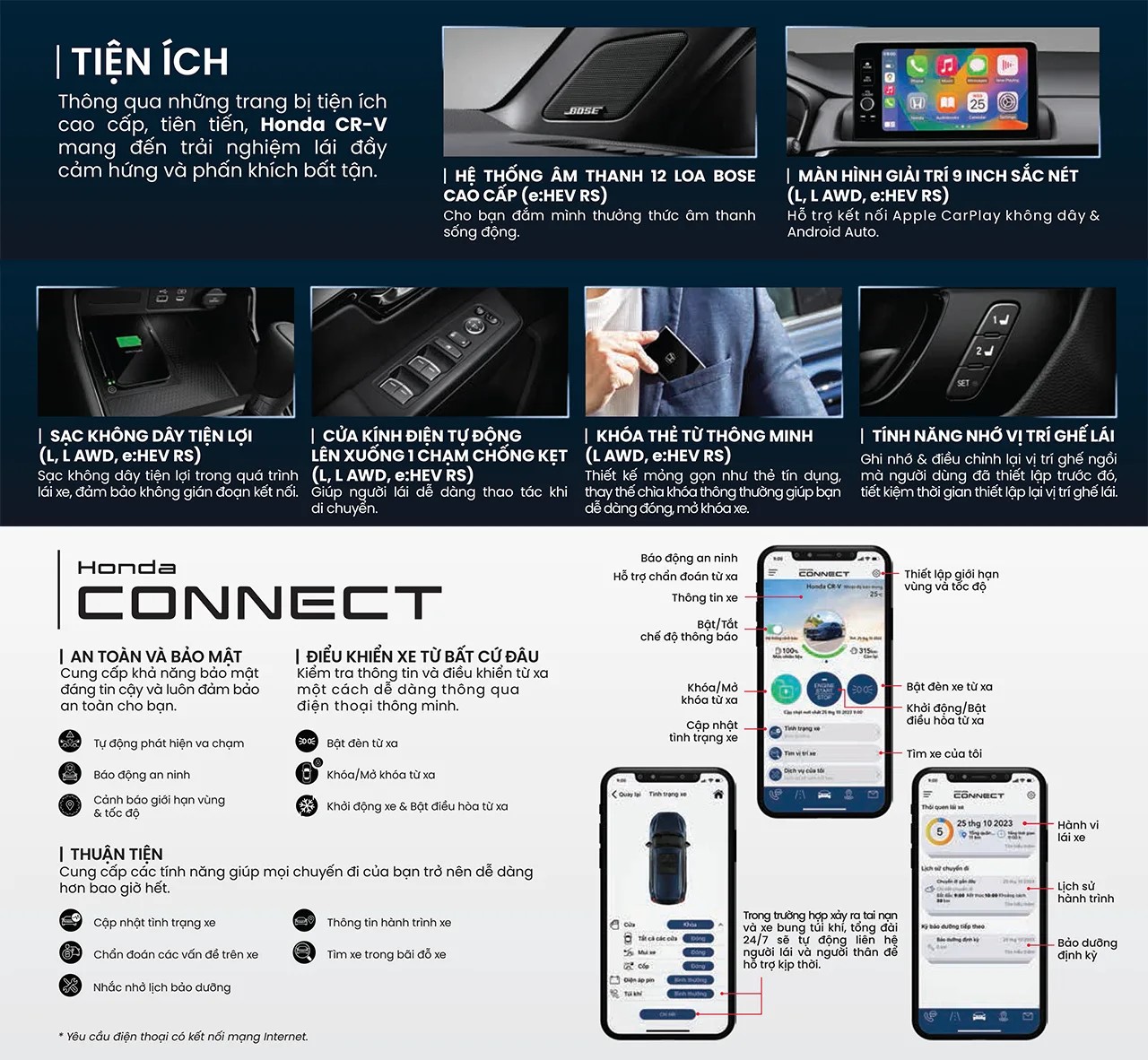 Nhắc đến HONDA SENSING, khách hàng không thể bỏ qua hệ thống Honda Connect - một hệ thống quản lý xe cao cấp qua điện thoại thông minh. Với Honda Connect, chủ xe có thể dễ dàng truy cập và điều khiển các chức năng bên trong xe, như: mở điều hòa, bật đèn xe, tìm xe, đề nổ từ xa và kiểm soát hành trình của xe. Hệ thống này còn có tính năng định vị GPS và hỗ trợ cảnh báo khi xe gặp sự cố giúp chủ xe có thể quản lý xe và bảo đảm an toàn cho gia đình.