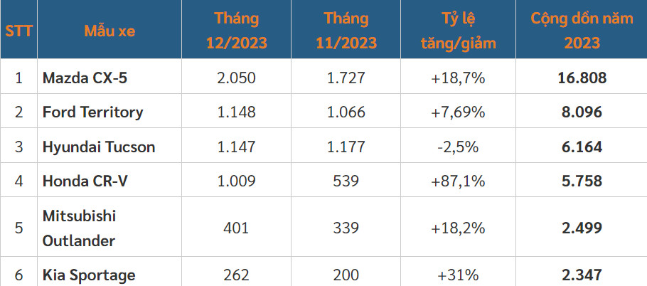 "Nói đến mẫu xe tăng trưởng mạnh nhất của phân khúc SUV cỡ C trong tháng 12/2023 thì phải gọi tên HONDA CR-V. Trong tháng vừa qua, mẫu xe Nhật Bản này ghi nhận doanh số 1.009 xe, tăng trưởng đến 87,1%." - Nguồn tinxe.vn