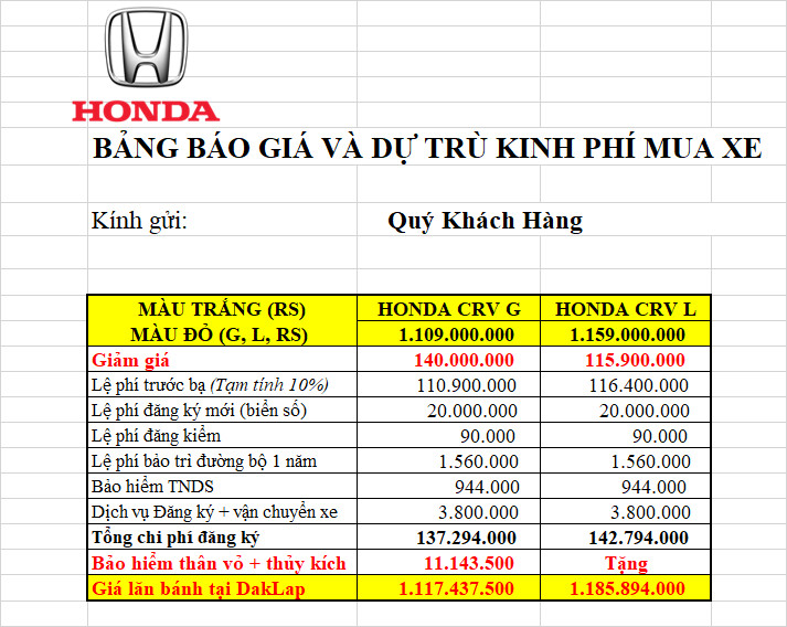 - HONDA CR-V L: 100% lệ phí trước bạ và 1 năm bảo hiểm thân vỏ