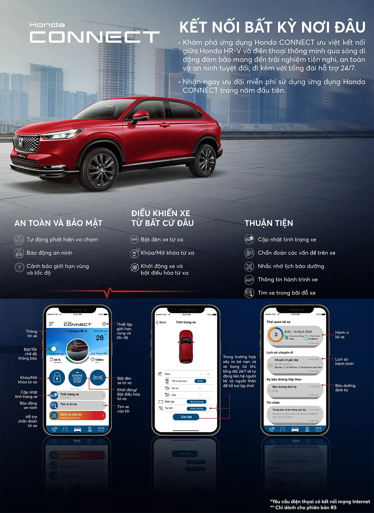 Honda HRV 2024 được trang bị Honda Connect - một hệ thống quản lý xe cao cấp qua điện thoại thông minh. Với Honda Connect, chủ xe có thể dễ dàng truy cập và điều khiển các chức năng bên trong xe, như: mở điều hòa, bật đèn xe, tìm xe, đề nổ từ xa và kiểm soát hành trình của xe. Hệ thống này còn có tính năng định vị GPS và hỗ trợ cảnh báo khi xe gặp sự cố giúp chủ xe có thể quản lý xe và bảo đảm an toàn cho gia đình.