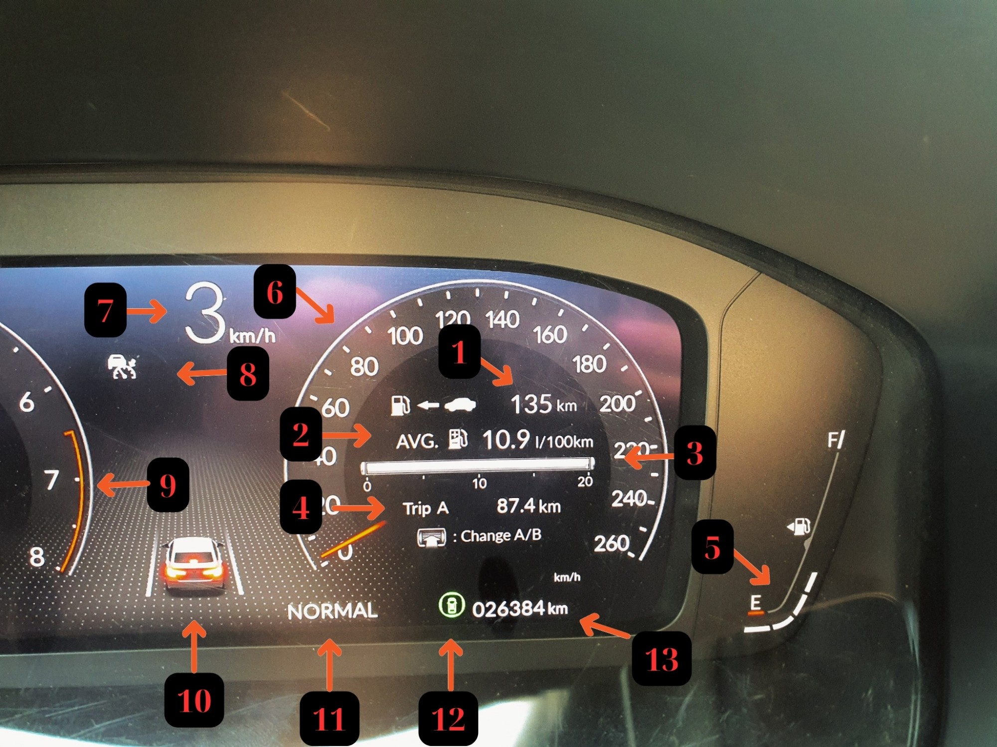 3. Lượng nhiên liệu tiêu thụ tức thời tại thời điểm đạp ga. Khi nhấn ga, khách hàng sẽ thấy thanh này di chuyển từ 0 => 10 => 20 tùy theo chân ga.
